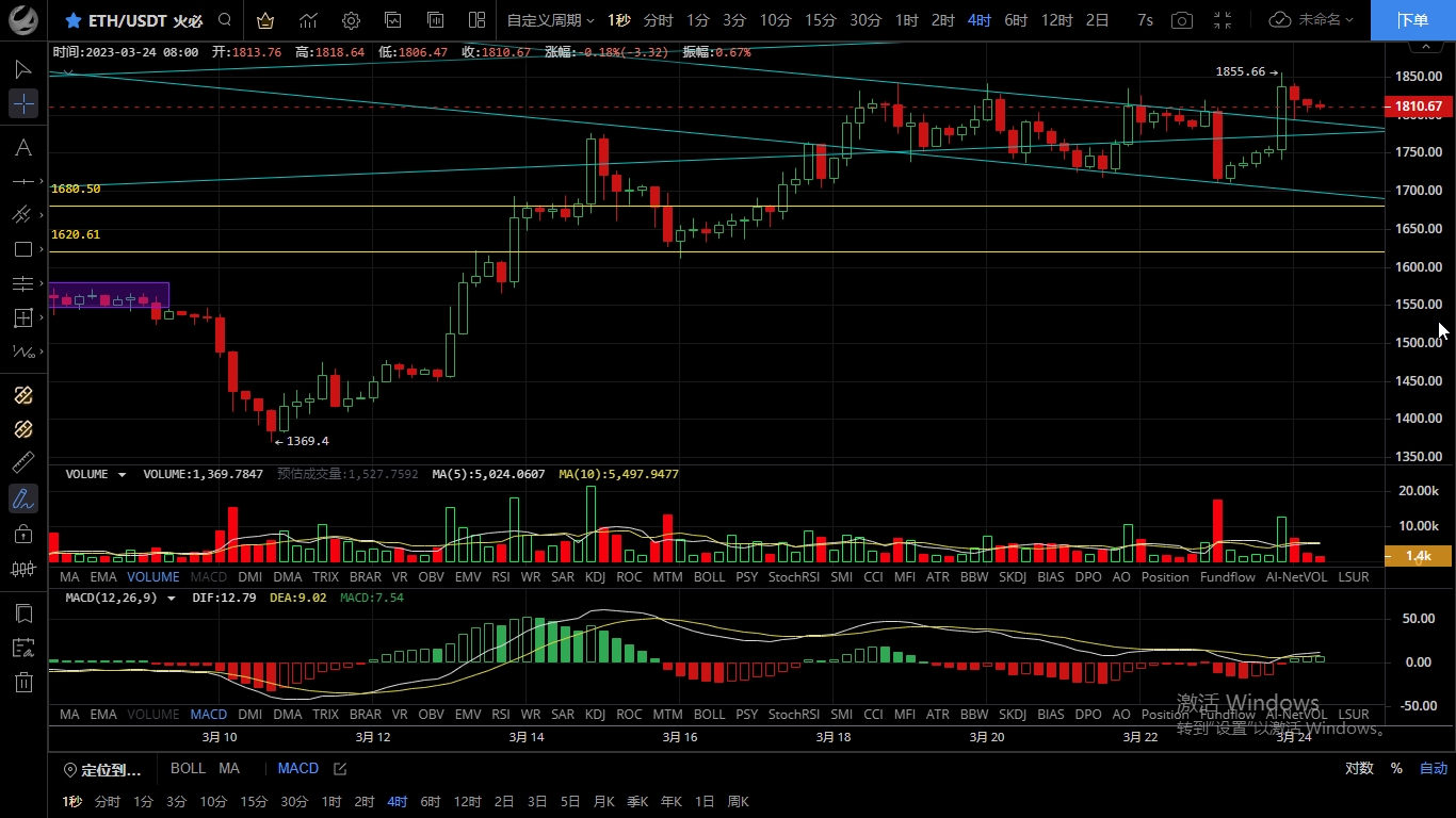 以太坊昨日白盘走势和大饼一致呈震荡上行,晚间多头发力强于大饼突破新高至1855一线承压回落,昨日文中提及的空单小幅获利20点,目前币价在1812附近运行,四小时级别如图所示前期行情回踩至通道线得以支撑,随后走出五连阳突破下降通道且回踩未破,macd多头运行,ma均线向上指引,但k线连阴指标相悖,短期有回踩均线的需求,日内关注1840阻力若能收线在上方有机会冲击下一个位置1880,思路建议回踩低多为主高空为辅,上方压制1840-1880,下方支撑1785-1755