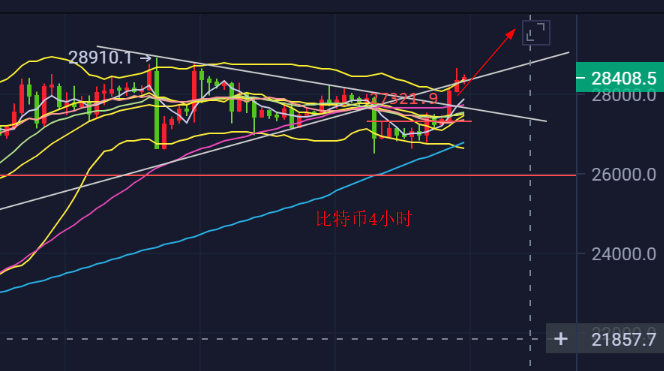 比特币自今天凌晨突破了周一晚上最后一次的反弹高点27450之后,今日早间测试27300-27200的区域之后一路上升,挑战28650前高点,亚欧盘走的还是比较强硬,与之前预期判断一致,那么新的高点很快就将冲破,美盘之前的回撤只能成为诱空,支撑点在28300、28000的位置,而在今天下午重新突破28500之后,我们也给到了回撤28300继续做多,上方看至29000以上,防守的点在27700的下方。