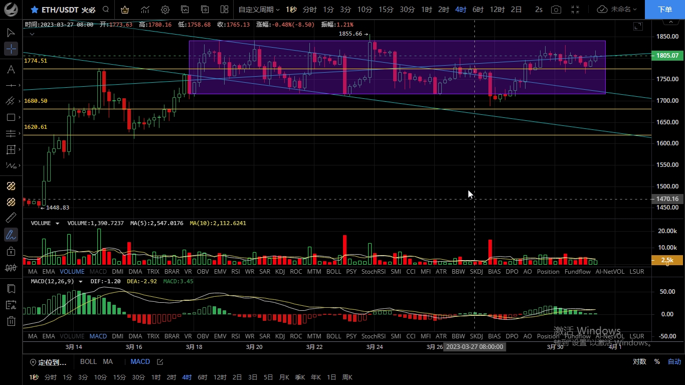 以太坊近期走势和大饼一致,昨日白盘震荡晚间空头发力开始下跌,最低至1763一线支撑反弹,恭喜跟上昨日思路的朋友多单获利50余点,目前币价在1802附近运行,四小时级别k线连阳再次拉回收复失地,短期行情上攻未能突破1820收上影线,macd多头温和运行双线粘合,整体呈多空博弈状态都没有延续,目前价格站在均线上方可见多头还是有上攻迹象的,若能有效突破1820后续则有机会放量破位新高,日线来看k线虽四连阳但多头力度偏弱,整体上行情没有明显方向,日内思路建议短线为主高空低多突破持有,上方压制1820-1850,下方支撑1760-1735