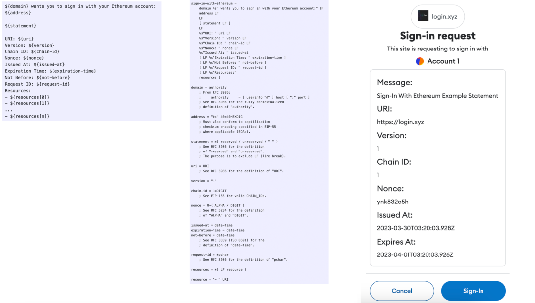 EIP-4361明确了以太坊账户如何通过链下服务进行身份验证的标准过程,这样身份验证通过签署标准消息格式进行,该消息格式使用会话详细信息、安全机制和范围进行结构化,即会以标准的字段参数进行展示,为开发者提供了Web2 和 Web3应用创建统一身份层的基础设施,这个过程对于用户来说是免费的,只需要在消息上进行签名,不需要与区块链进行交易,也不需要向矿工支付Gas。