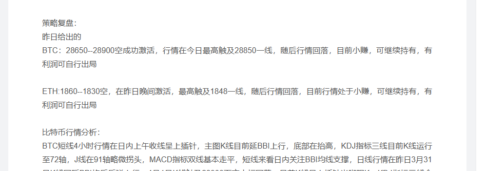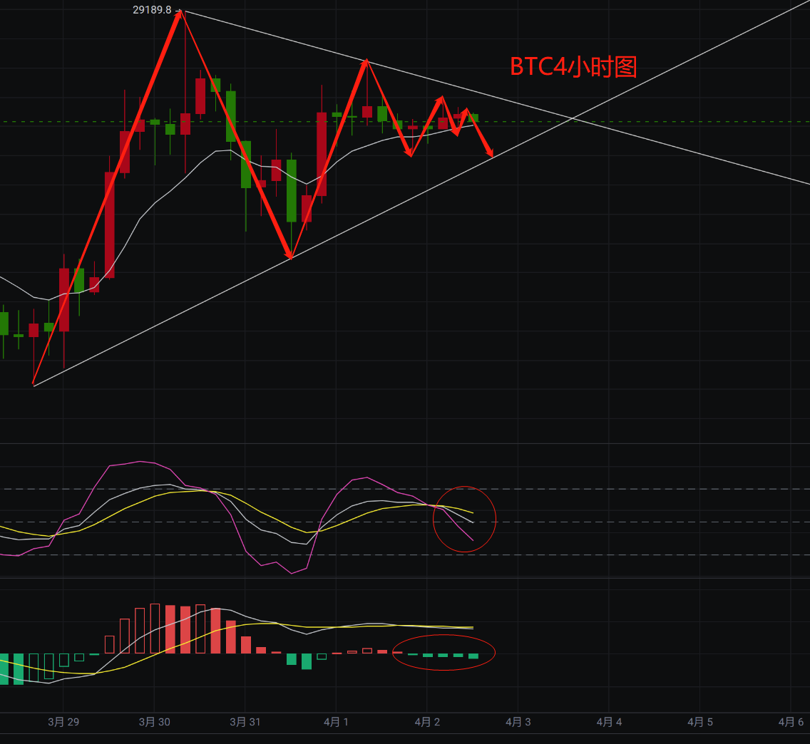 BTC行情在周末行情进入窄幅震荡,行情当前呈三角型震荡区间收敛,KDJ指标三线死叉向下发散,MACD指标绿色实体动能柱小幅放量,日线行情4月1日K线收线呈十字阴K,行情承压在28900下方,MACD指标双线死叉向下,绿色实体动能柱放量,日线行情关注下方BBI均线支撑,综合来看:目前行情进入选边阶段,上方抛压过重,建议还是以高空为主