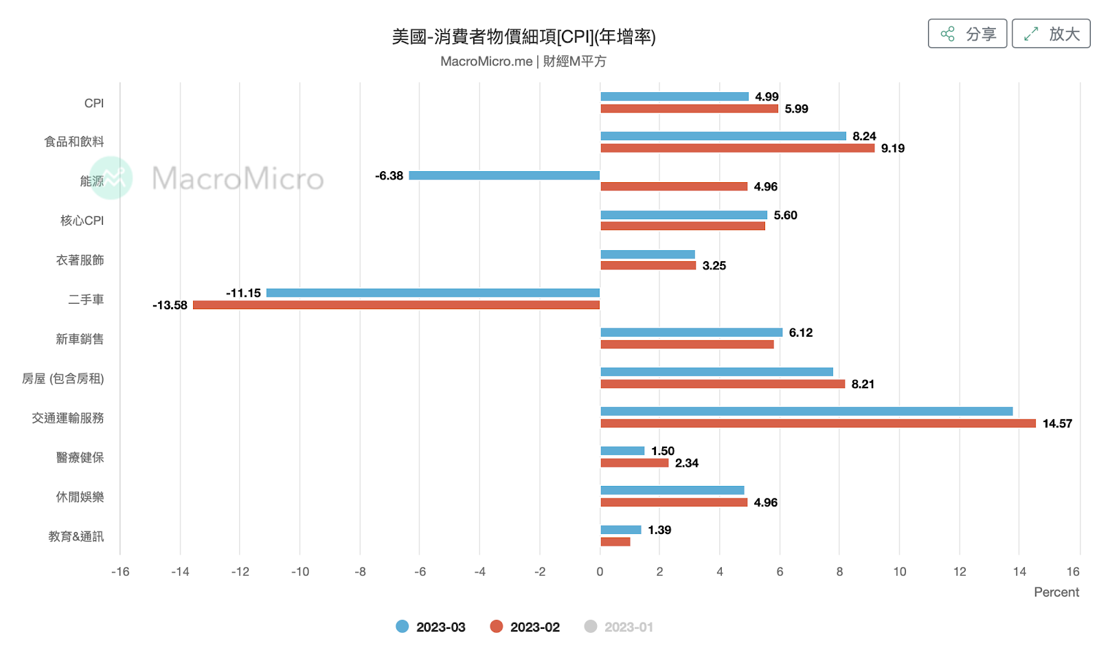 通过上图看3 月份CPI 各项物价细项( 蓝色部分) 可以发现如我上述所说的,能源以及二手车部分在年增率上是跌不少的,而这就是为何这次开出的CPI 数据从年增率来看下降了不少。