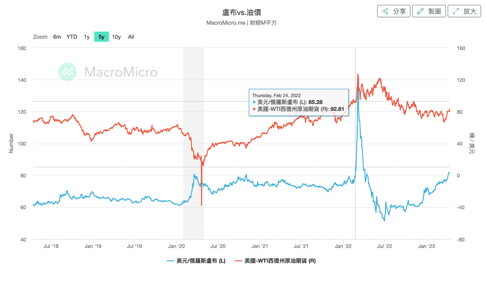 首先,年增是对比去年同月份的数据来做对比。而乌俄战争是在2022 年2 月24 日开打的。而刚好CPI 数据公布的数值是前一个月的数据,而这场战争对经济最直接的影响就是油价。俄罗斯为原油第三大生产国与第二大出口国,当时在真正开打前原油期货的价钱就开始拉升,如下图: