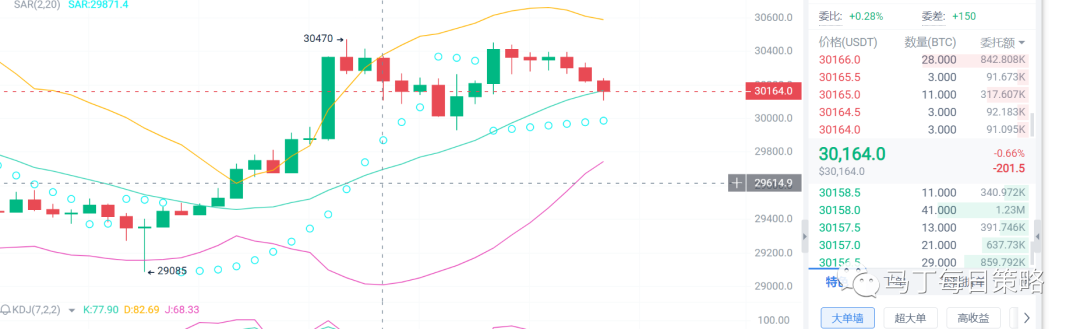 昨日大饼在开盘过后走了一波小幅度回踩动作,最低29097一线,随后行情一路震荡上行,直至晚间最高拉升至30492一线,目前币价企稳在30000附近震荡运行。