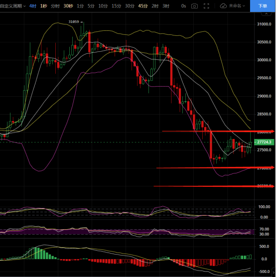 行情分析:四小时图来看布林带呈缩口状态在运行,币价一直位于布林带中轨下方阴阳交替运行,在插针下探未破支撑后,逐步反弹上行,说明底部支撑较为强劲!但行情并给出有力的反弹,反弹力度明显偏向弱势,个人觉得回踩并未结束,若如市场想要再次冲高破位,那么整体还将继续走出更深一步的回踩蓄力空间,MACD双线在0轴下方交叉成金叉有往向上运行的趋势,多头能量柱保持放量状态运行,kdj和RSI三线交叉向上发散形态运行。咱们现在关注下方第一支撑关注27000的支撑,第二支撑26500,上方关注28000小级别压力。目前有止跌的信号,但并不能判定开始反转,操作上可在区间内高空为主,低多为辅。