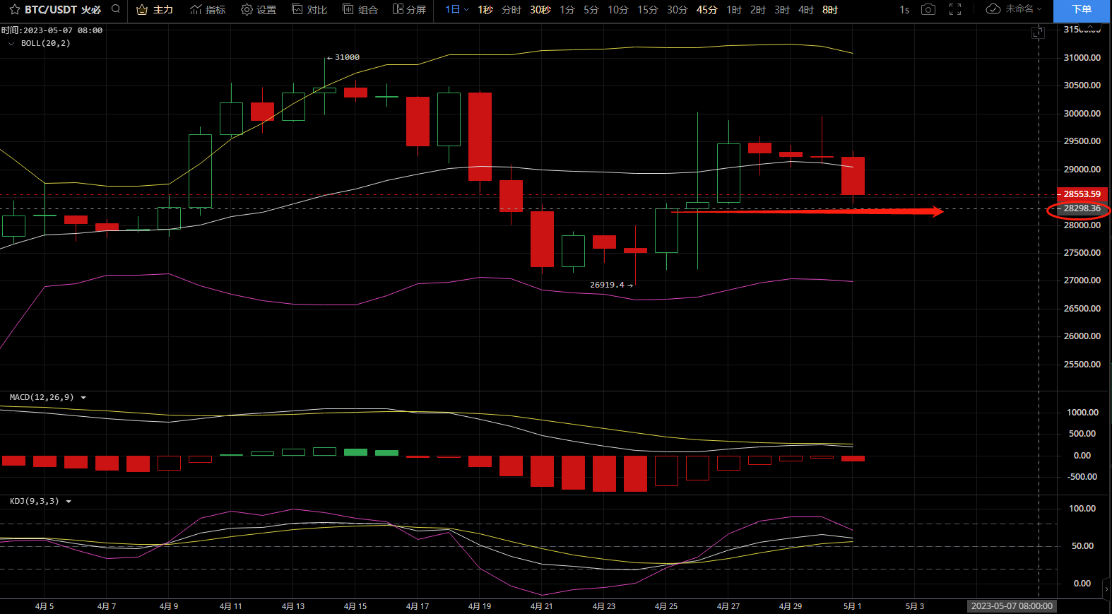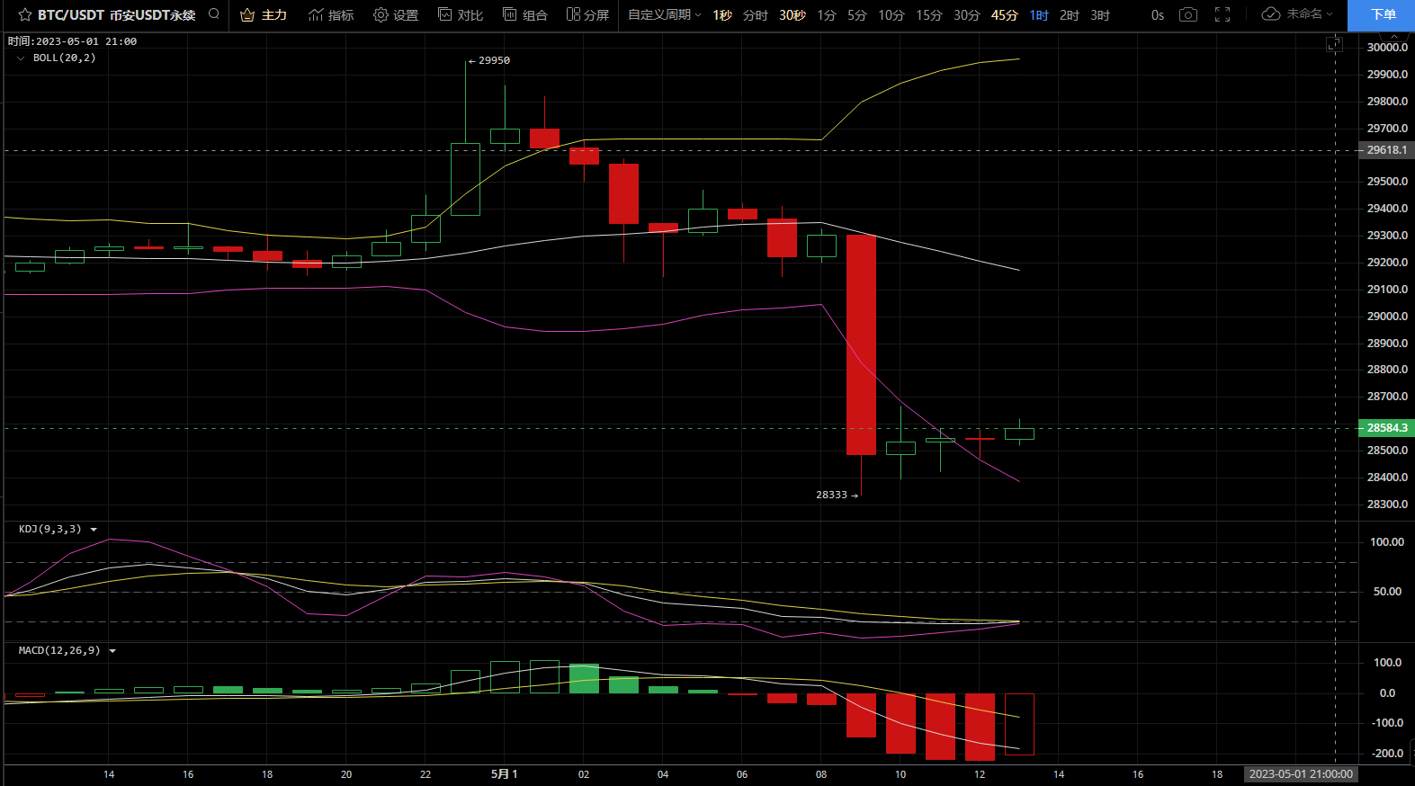 从小时线看今天大饼的价格一路回踩至28300附近,现在处于一个震荡状态。同时kdj出现交叉迹象,个人预判是有一波小拉升的,激进的币友是可以现价28500做多的,仓位小的币友也可以等待震荡区间内的一波小幅度回踩到28400再进。