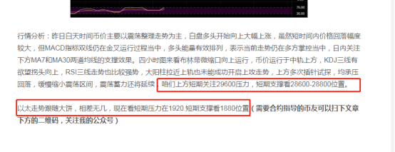 大饼就不做分析了,咱们可以看短期支撑还是看28600-28800这两个位置,压力看29500-29600位置(需要合约指导的币友可以扫下文章下方的二维码,关注我的公众号)