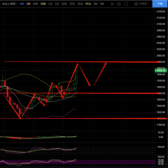行情分析:四小时图来看布林带微缩口向上运行,运行通道向上打开,币价运行于中轨上方,低点不断抬高,高点不断在刷新,目前4小时币价呈现三浪结构走势,现在目前谨慎追多,短期压力可看1960和1980两个位置,短期支撑可放在1880,第二支撑在1800位置,,MACD双线向上运行,多头能量有效排列,KDJ和RSI三线拐头向上,晚间操作上建议以低多为主高空为辅操作即可。