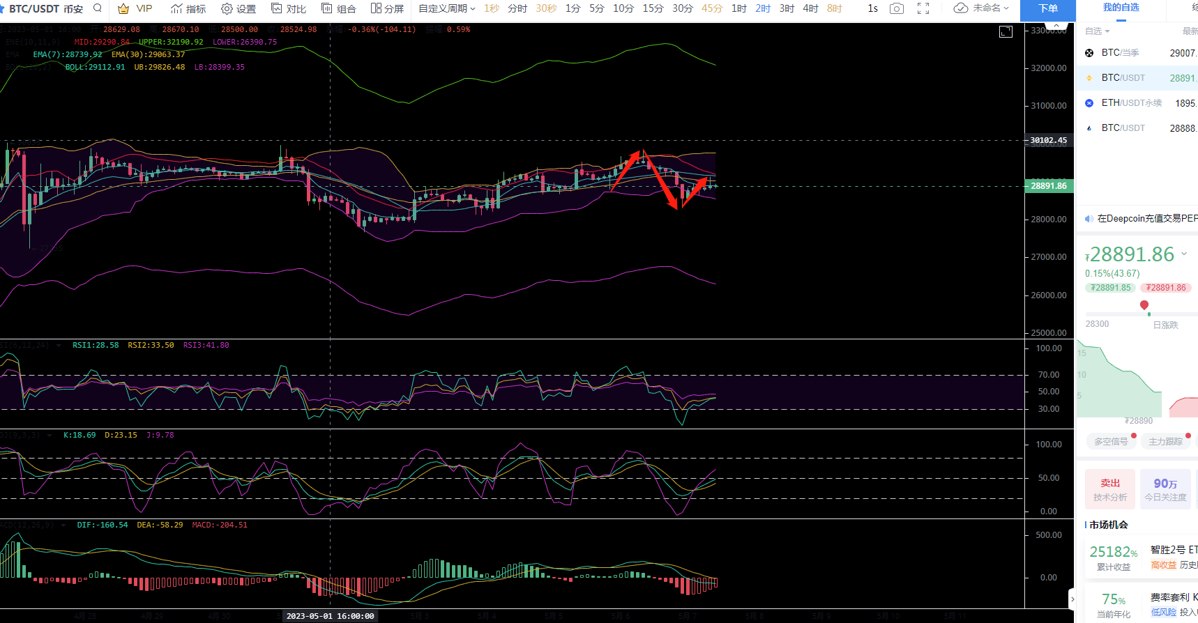 比特币行情在昨日早间冲高至29800一线,然后一直处于回落状态,直到晚间一波下跌高潮,价格直接下跌到28300,日内幅达到1500点,经过过山式走势,币价在凌晨回升后稳定在28900附近。