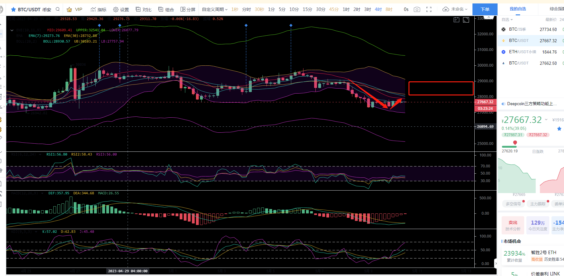 4小时来看比特币在跌到27300附近止跌 ,目前已经震荡8小时 ,大盘走势依旧偏弱,短期向上行 ,在上行后 触及28000随后再下去试探27300一线,目前还是处于震荡,这种行情非常适合高空低多,具体大行情的操作点还得看晚上。