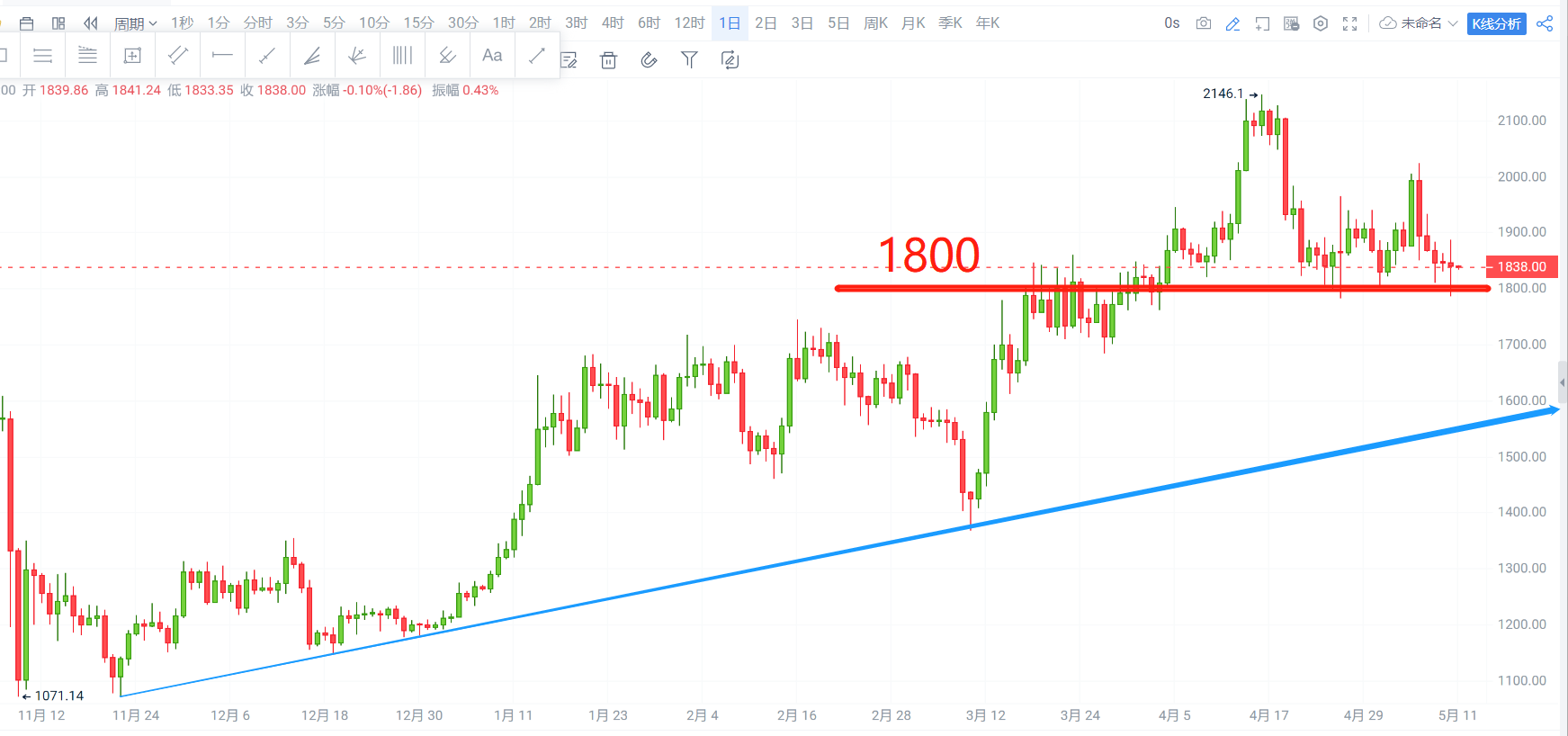 日线:价格上破1800一线后维持在其上方震荡,后期关注其形态变化。