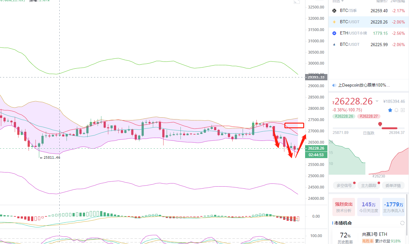 比特币午夜的行情走势阶梯式下跌,当午夜消息面结束过后,比特币行情回调至26000附近,直到早间大饼再次打破下方支撑在25860一线,总共跌1300点,以太坊跌100多点,我们昨日安排的空单思路也如期拿下!昨日上午给的策略在行情暴跌之前,唯有清晰结构才能精准的捕捉到机会并且全程有清晰的指导。