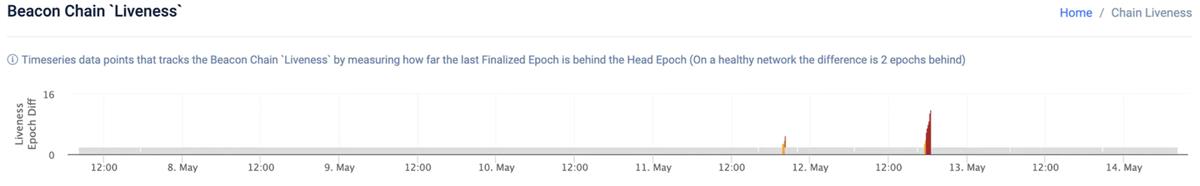 2023 年 5 月 11 日和 12 日将成为以太坊历史上具有重要意义的日子,因为在这两天,以太坊的韧性受到了严峻的考验。5 月 11 日,约在 20:19 UTC 时,以太坊主网网络出现了区块产生速度的显著下降,导致最终确定延迟了四个纪元(epoch)——这是以太坊的第一次。第二天,发生了类似的事件,这次将延迟延长到九个纪元,并导致了不活跃惩罚。