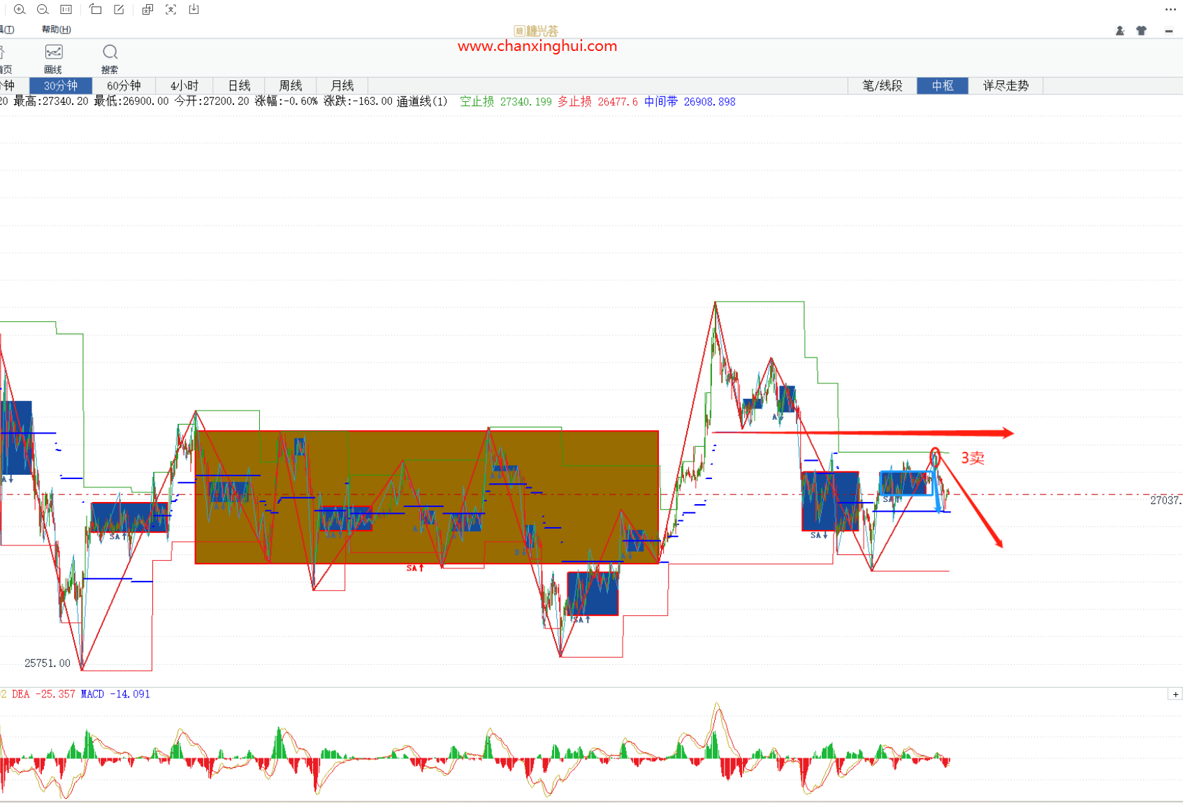 30分钟级别反弹一段可以结束,出现30分钟3卖,继续空头延续;一笔下有力打下中枢,弱反弹不出新高则继续空