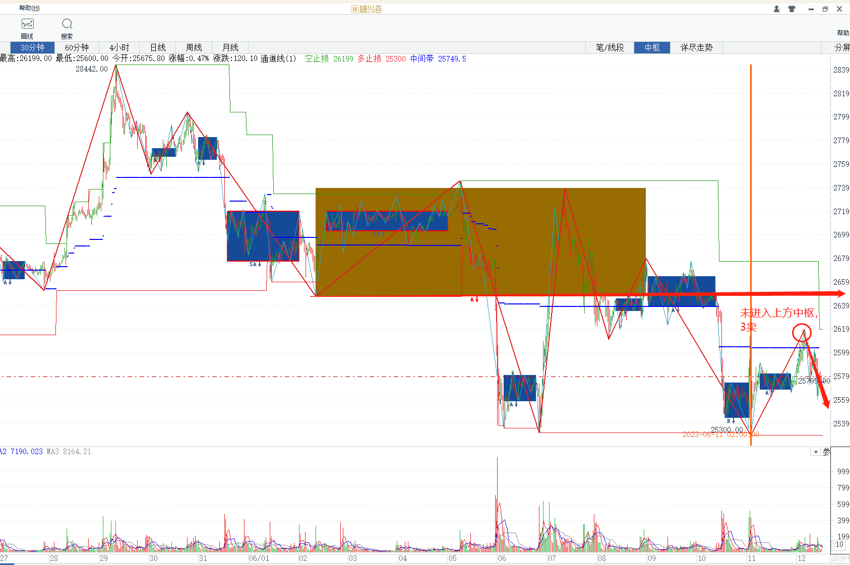 30分钟一段的反弹,力度比较弱,出现中枢3卖,依然是空头延续,要注意3卖之后买卖点转化