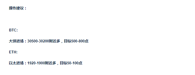 昨日大饼,早间持续窄幅震荡,午后空头逐渐发力,价格呈阶梯式回落,跌幅持续到晚间,大饼最低来到30200一线,以太最低来到1893一线,直至美股开磐才止跌,随后开始走震荡,呈慢慢上阳趋势,不难发现,大饼和以太的价格冲高又回落,经过了几天的波幅,再次回到月初的震荡水平。昨日在文章中操作建议先回调在去做多,行情也是如期而至,也是到了我们低多的进场点位,昨日多头反响并不是很强烈,震荡行情的走势就是给不到太大的単边,无论多空,只要有的吃就要落袋为安,这是我们散户唯一能做的,今天要注意的就是凌晨两点的美联储公布货币政策会议纪要,这个消息面对于我们圈子还是有很大影响的,所以本交易日内尽量不要做隔夜単。目前大饼在30400附近运行,,短期没有破位迹象,预计将延续震荡.废话不多说,咱们看看今日盘面走势情况。