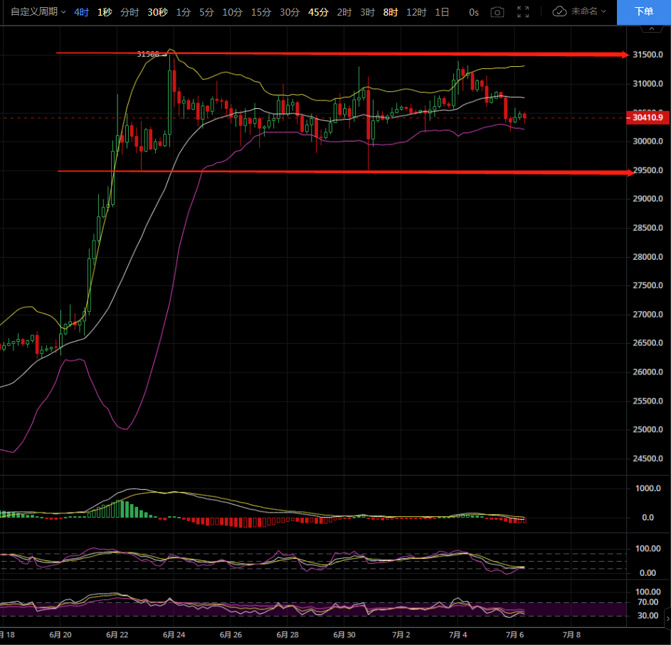 从四小时结构图来看,可看出近期空头情绪是要比多头稍微强烈一点,前期千点的波动一天就能跑完,但是目前来看两天走完一个区间之后下方多次试探未能刺破就可以考虑反手做多了,下方一线支撑暂且关注30100。布林带开口运行,币价冲高受阻于前高,有效压力导致行情再度回调,目前币价沿布林带中轨下方运行,整体走势依旧保持在震荡区间里运行,大方向并未发生变化,MACD快线已穿过0轴下方,空头能量柱开始缩量运行,KDJ三线有拐头向上的迹象,RSI走势比较焦作,整体走势是来看我们日内思路可继续围绕着回踩看涨来进行布局。(操作中还比较迷茫的朋友,不妨多看看智多星的策略,24小时实盘指导,行 情 波 动 的 比 较 快 , 由 于 审 核 时 效 性 影响 , 对 于 后 续 的 行 情 走 势 , 以 实 盘 实 时 布 局 为 主 ,需要合约指导的币友可以扫下文章下方的二维码,添加我的公众号)