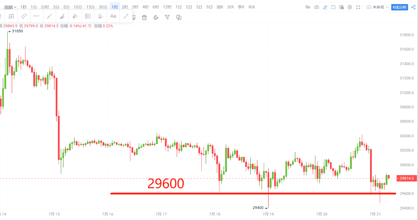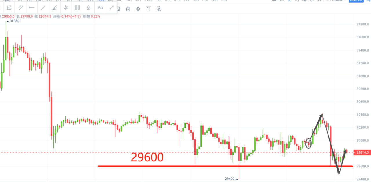总结:价格短期走势下探29600一线位置后有所反弹,后期走势若回调不破此支撑则有望扩大反弹空间,上方阻力关注30850,31550线;若后期下破此支撑则继续回调走势,下方支撑关注28990,28220一线。