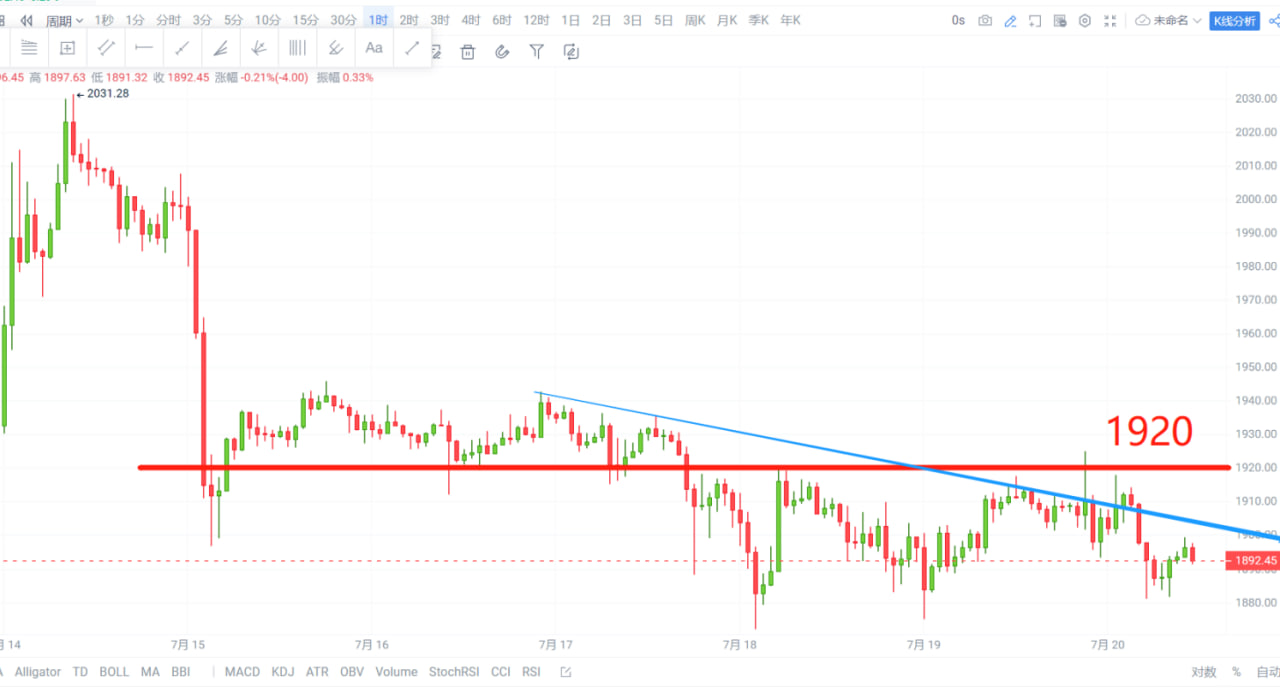 后期走势上探1920一线阻力后再次回落,最低抵达1875一线。
