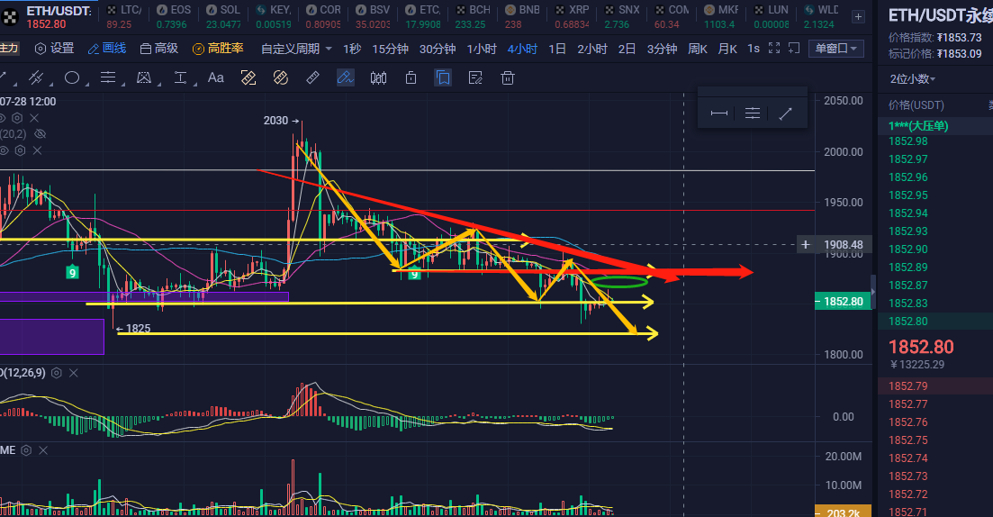 ETH:操作建议上方1870点附近接空,风控1905点,目标1820点。