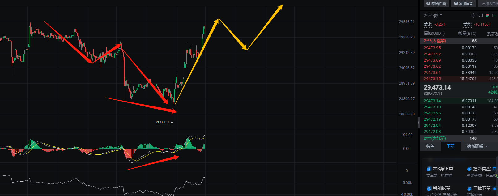 Structure of Bitcoin on the 15-minute chart. The current trend of Bitcoin on the 15-minute chart is as shown in the image. The red on the left represents three downtrends on the 15-minute chart. In fact, the third trend is not a divergence, but a direct pullback. However, we also see a bottom divergence on the 15-minute chart, indicating the end of a downtrend on the 15-minute chart and the start of a rebound on the 15-minute chart. But currently, the market has directly pulled back. Since it has pulled back and returned to the center, we will consider this as the end of the downtrend on the higher 1-hour chart, representing the end of the short-term downtrend. We will see if it can follow the upward trend as shown in the first image, representing a 4-hour upward trend. Currently, it is in the first upward trend on the 15-minute chart within the 1-hour upward trend.