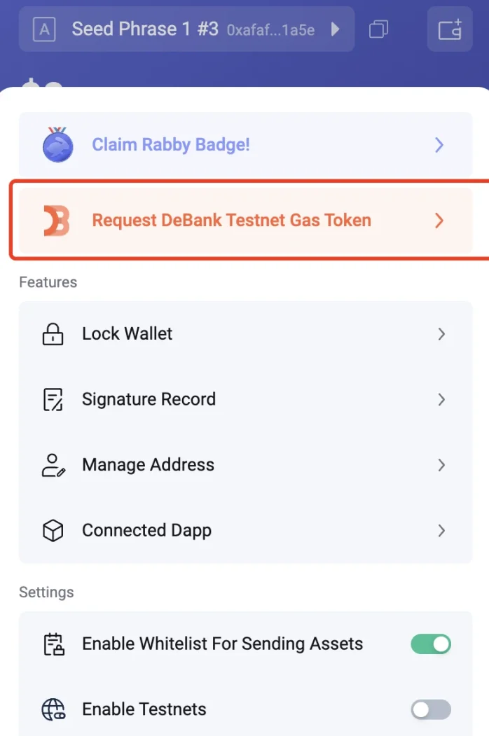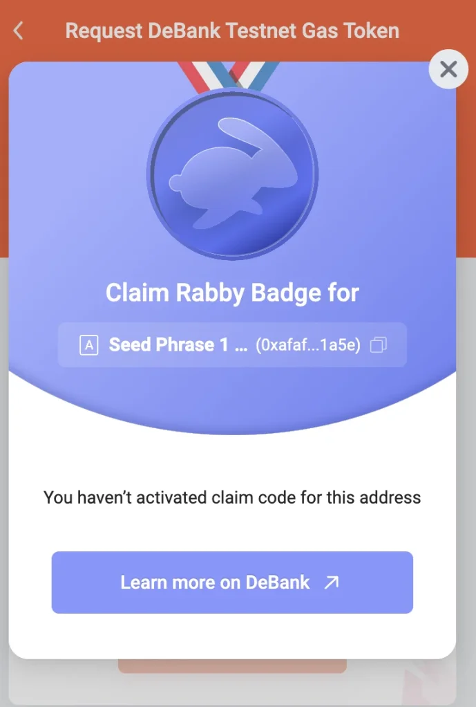 - To obtain testnet gas tokens, you need to meet the prerequisite—hold the "Rabby Badge" and claim this badge first.