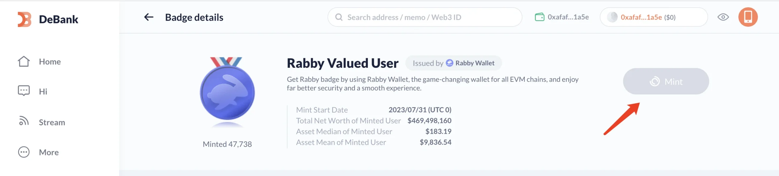 - Follow the wallet instructions, you need to jump to DeBank first, then mint a badge called "Rabby Valued User".