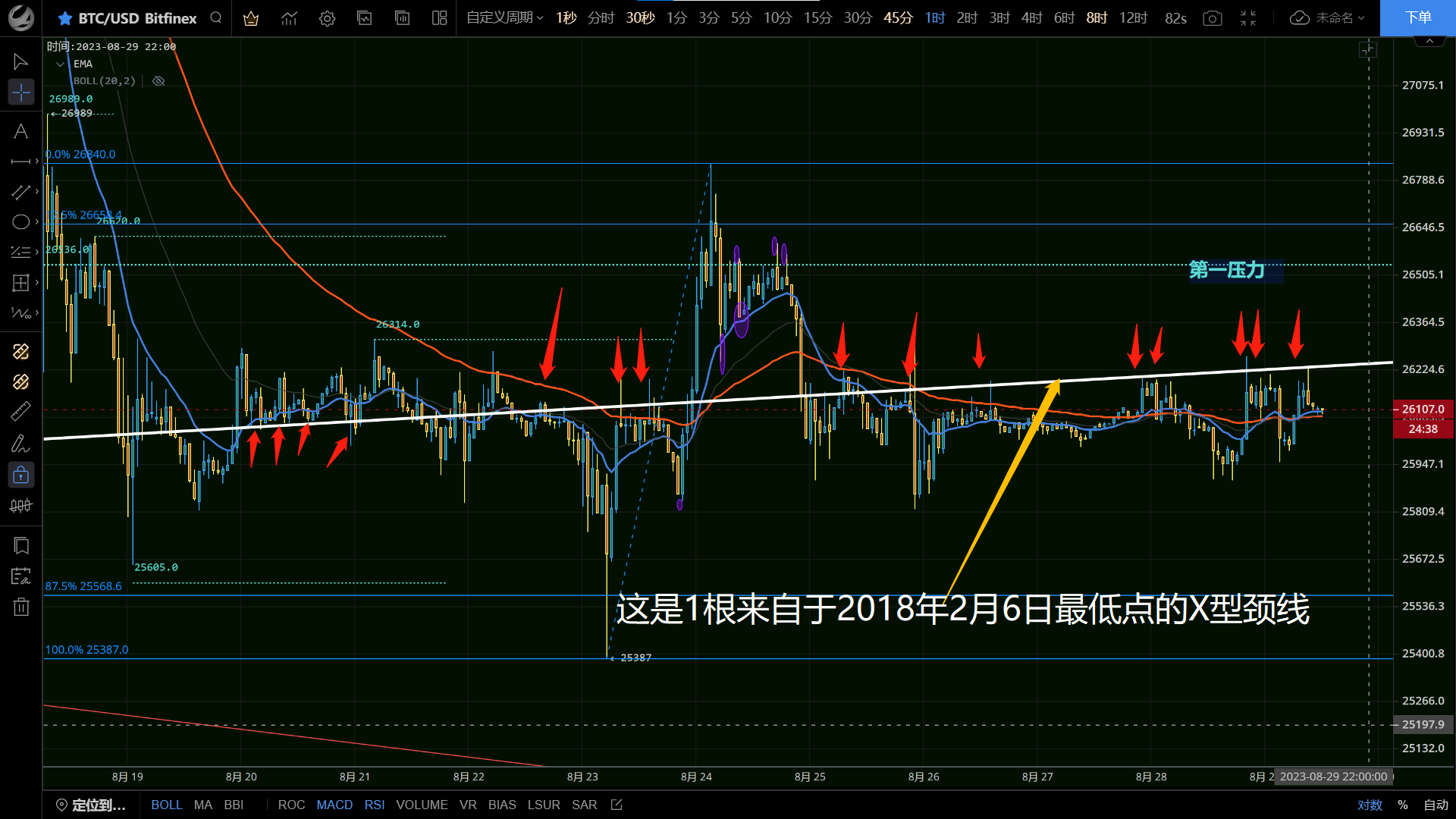 BTC and ETH are oscillating up and down along the 1-hour EMA60, just as I predicted last Friday: it's actually a short-term gift. Since it's a gift, be careful when returning the gift, as they may suddenly go berserk! So fasten your seat belt and set your stop loss! At the same time, last week I mentioned that there is a neckline "X" line from the lowest point of 6000 on February 6, 2018, which has experienced multiple weekly highs and lows, playing a very strong role in pressure support, and is currently affecting the market trend at a small level around this neckline, providing many short-term opportunities. Other altcoins also have opportunities, how to operate? Please click the video link below to watch.