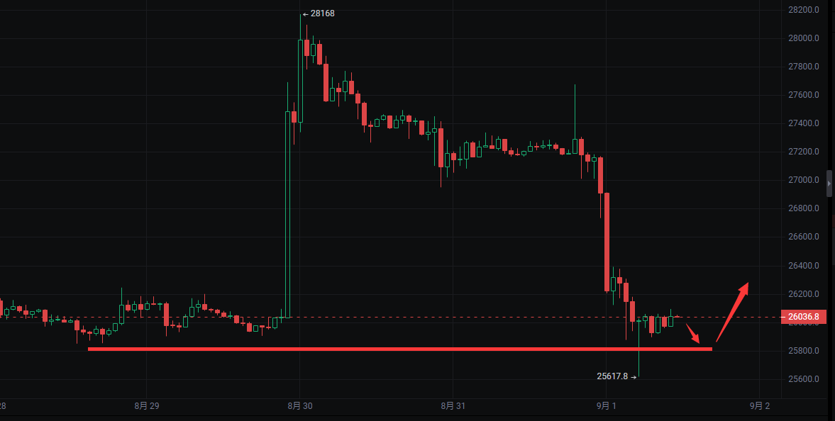 First, let's review yesterday's market trends. Yesterday was the last day of August, and the price of Bitcoin was near 27,050. During the day, there was a bullish sentiment, and in the evening, the price rose to around 27,670 before quickly retreating. The evening suggested a bearish outlook, and currently the price is near 25,900.