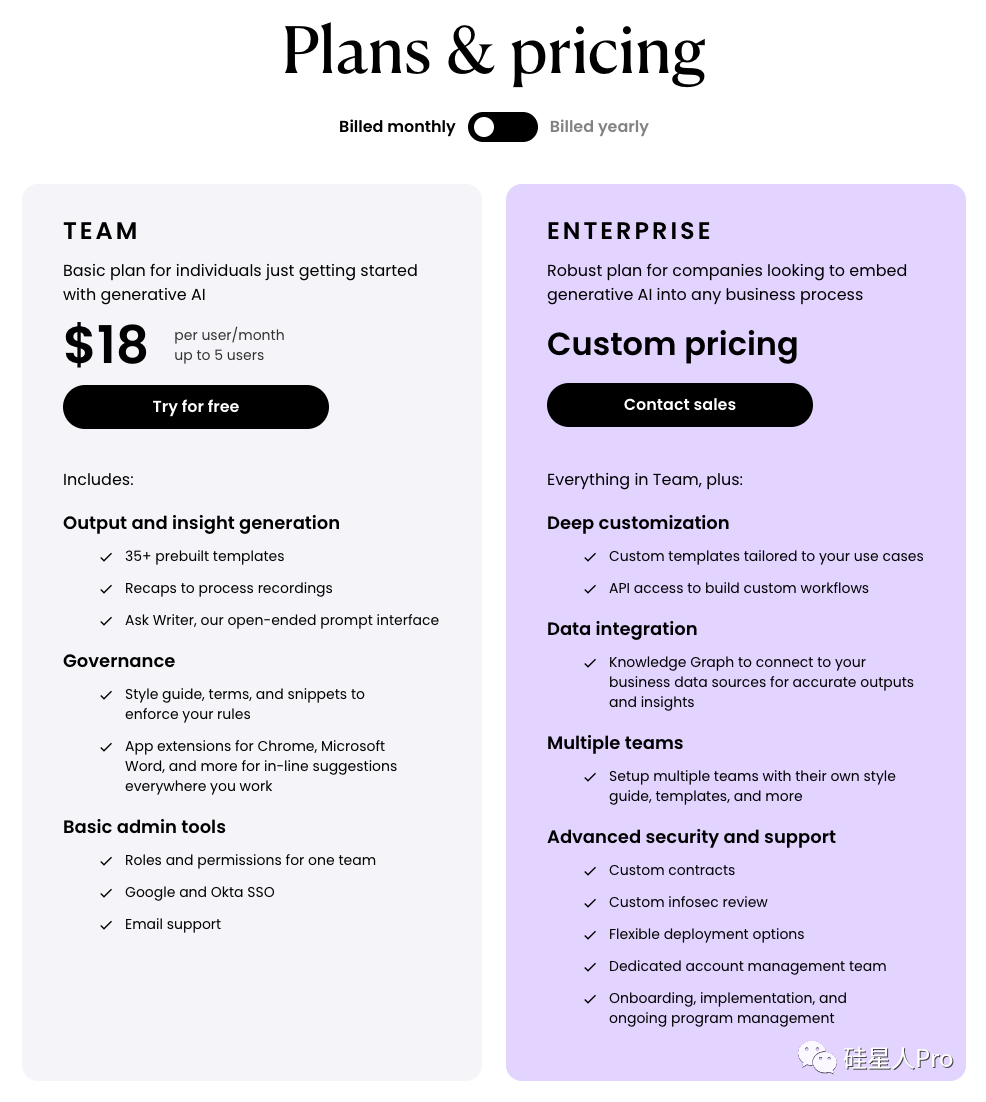 Currently, Writer offers two pricing models tailored for individuals and small teams, as well as customized for enterprises. The former is priced at $18 per month or $162 per year, supporting up to 5 users and including features such as content generation, pre-built templates, voice summary processing, Ask Writer interface, email, basic admin tools, and more. The latter includes the above features as well as support for multiple teams, API access, data integration, deep custom templates, advanced security support, and requires consultation for customized service pricing.