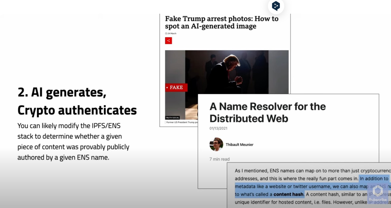 AI generates content, encryption verifies it. In fact, for encryption verification, we already have some specific architectures, such as ENS/IPFS. If you have the content hash value, you can go and retrieve it, and you can also map it to an ENS name. For example, if the content is signed, then you can use it to determine whether it is artificially generated content or human-generated content. Of course, humans can also sign artificially generated content, but at least you know which ENS name it came from (ENS does not necessarily have to come from an individual, it can also come from a company, etc.).