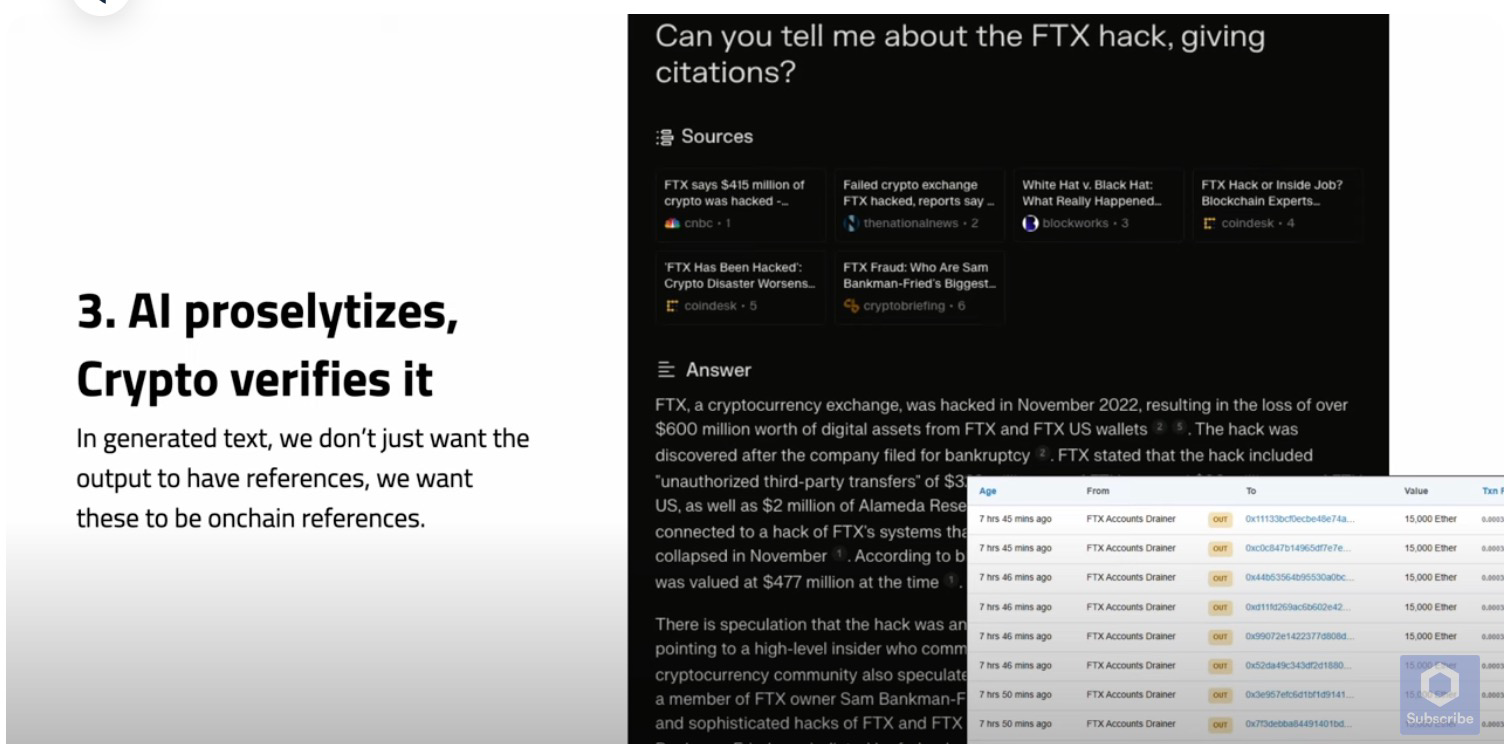 AI propagates information, encryption verifies information. This is important, because once there is a source, once there is a citation, artificial intelligence will perform encryption verification. For example, there is a service called "perplexity.ai," last year I had it tell me about the FTX hacker incident. Ideally, what you want is for these citations to be on the chain. Some people may think that only some content can be proven on the chain, such as financial records. I agree with this view, but it's a bit like saying in the 90s or early 21st century, when there wasn't as much internet content or network content, you didn't know how fast it would develop in the future.