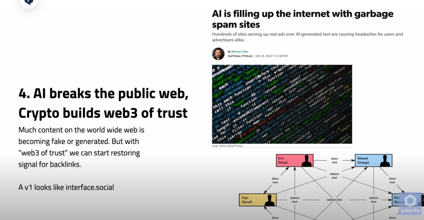 Therefore, one way of thinking is that AI breaks the public network, but Web3 establishes a trust network. The internet is now filled with artificially generated false content, perhaps Google can solve this problem, but the ideal solution is an application like "interface.social." You will find more different types of data, not just financial transaction data, but also social interactions, and so on. It actually shows what a good trust network looks like—many interactions are on the chain, and you can perform encryption verification on many different aspects of these interactions.**** Not just verifying individual actions, such as this entity signing this content, but you can also verify all other actions of this entity, and you can start to calculate whether this entity is actually human. This is why we can build a Web3 trust network. You are not just looking at what the **public key** signed in terms of transactions, but you are macroscopically looking at the interactions of this **public key** and other **public keys** in the entire network, ****