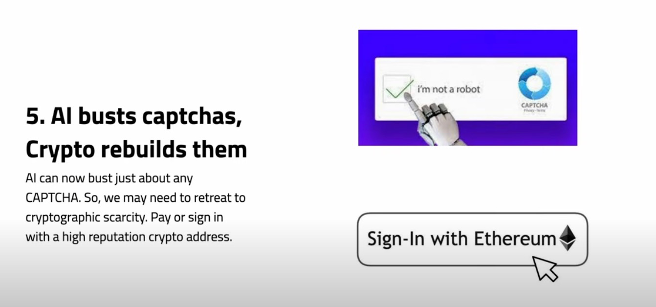 AI makes captchas ineffective, encryption rebuilds captchas. As shown above, a robot is clicking on a captcha saying "I am not a robot." But cryptocurrency can change this situation, if you sign them with Ethereum, you can request small payments, view payment history, or pre-stake a portion of funds, and so on—basically increasing the cost of forgery, and of course, robots can still log in with Ethereum, but you can charge them high fees to prevent them from doing so.