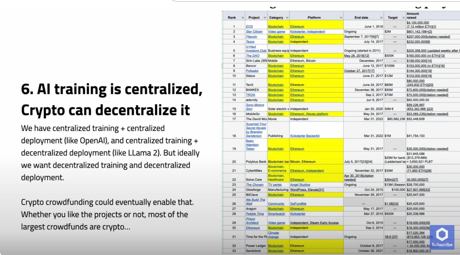 AI training* is usually centralized, and encryption technology can** decentralize** it.* Now we have centralized training and centralized models (like Open AI), and we also have centralized training and decentralized models (like LLama2). But ideally, we also want to adopt decentralized training and decentralized models. If you look into it, you will know that most of these projects involve cryptocurrency. You may not agree with what these projects are doing, but that's not really important—the key is that we can raise a large amount of funds through cryptocurrency crowdfunding, and we can use these funds to train artificial intelligence models.
