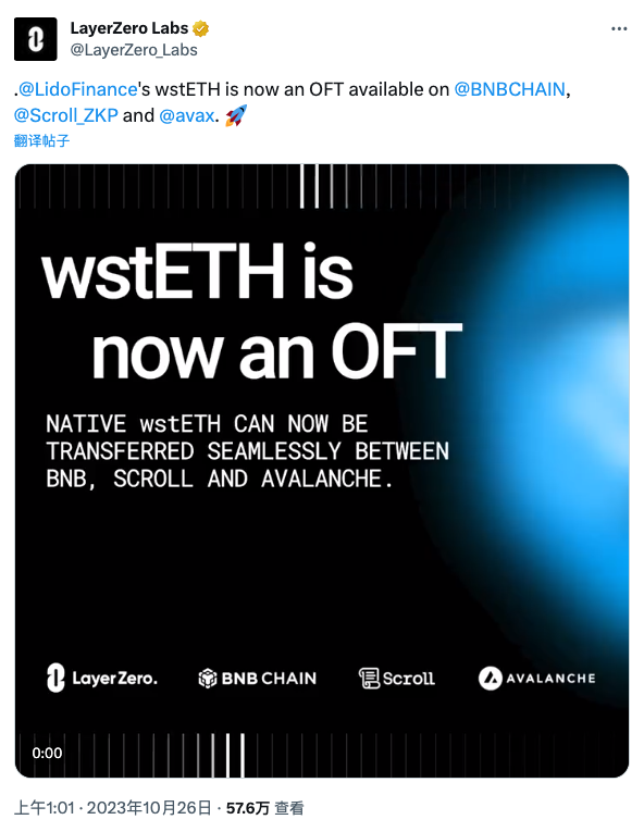 According to BlockBeats news, on October 26th, the cross-chain interoperability protocol LayerZero announced an important news: the launch of the wrapped stETH (wstETH) function for transferring liquidity staking protocol Lido Finance on Ethereum, Avalanche, BNB Chain, and Scroll.