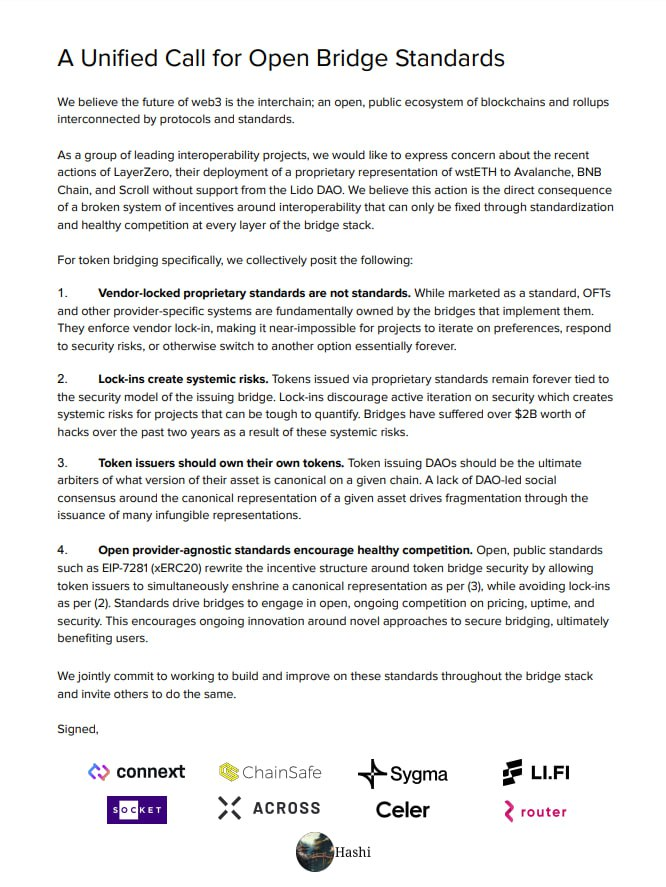 In their joint letter, they expressed concern about LayerZero's recent actions: "LayerZero deployed the proprietary standard of wstETH to Avalanche, BNBChain, and Scroll without the support of Lido DAO. We believe that this action is a direct consequence of the collapse of the interoperability incentive system and can only be repaired through healthy competition at every layer through standardization and bridging."