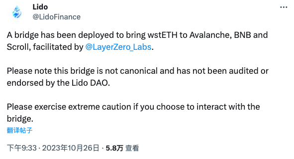 Lido's official statement also warned: "Under the promotion of @LayerZero_Labs, a bridge has been deployed to introduce wstETH to Avalanche, BNB, and Scroll. Please note that this bridge is not standardized and has not been audited or endorsed by Lido DAO. If you choose to interact with the bridge, please be extra cautious. Proposals for Lido DAO to support this bridge must still go through the necessary checks, discussions, and governance processes."