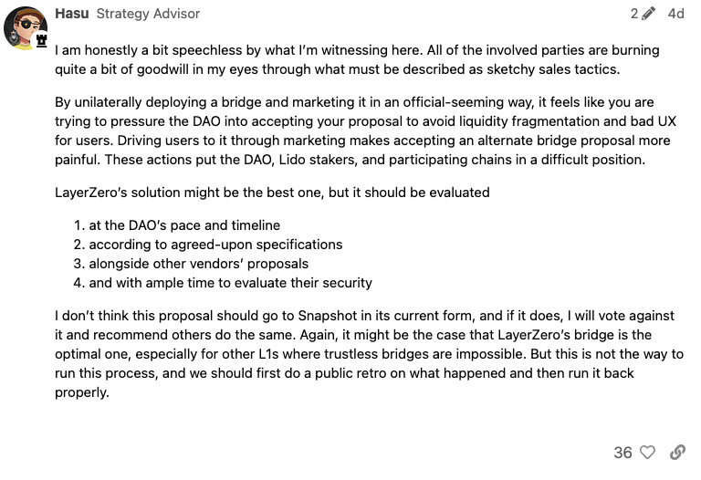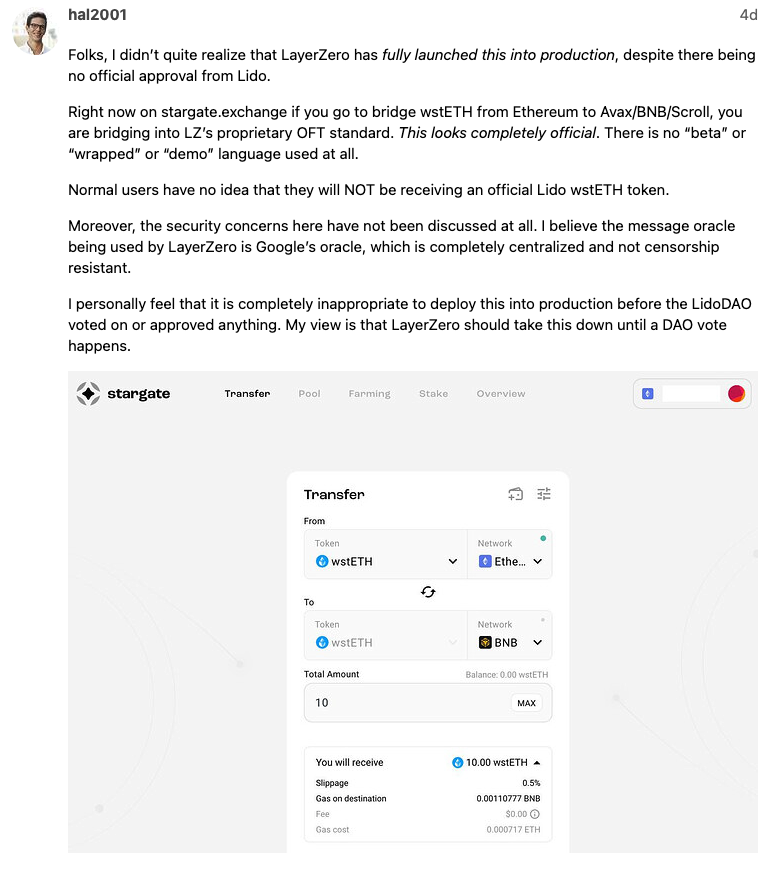Community member hal2001 stated: "I hardly realized that LayerZero had fully deployed it into production, yet it did not receive official voting and approval from Lido. Now on stargate.exchange, if you bridge wstETH from Ethereum to Avax/BNB/Scroll, you are bridging to LZ's proprietary OFT standard. This looks completely official. There is no use of 'beta' or 'wrapped' or 'demo' language at all.