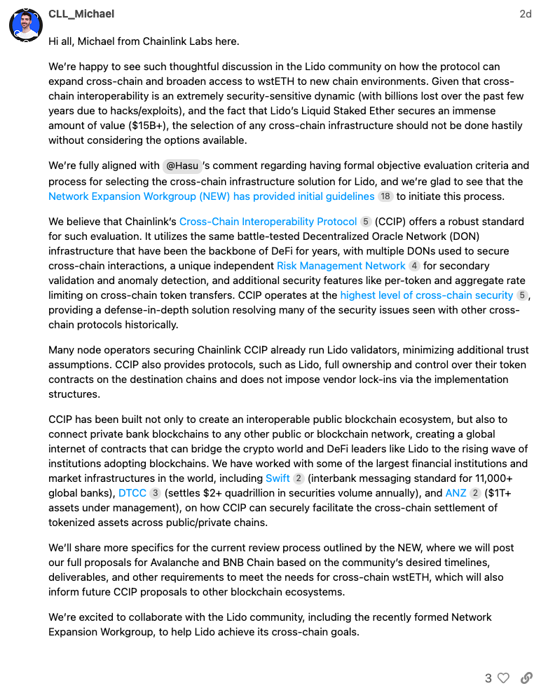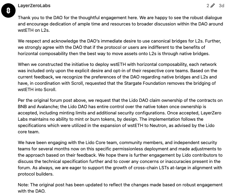 In contrast, the official response from LayerZero seems very official: "Thank you for the active interaction and strong dialogue in the DAO. We encourage broader discussions in the DAO about wstETH on L2. We support the DAO's use of L2's standard bridging and believe the best migration method is native bridging. We are working with the core team to jointly decide, hoping that Lido DAO will manage the BNB and Avalanche contracts. We have long been working with the Lido team, adjusting strategies based on feedback, and look forward to more technical discussions. We always support the growth of cross-chain LST."