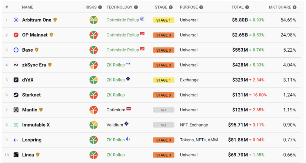 Figure 2. Status of the top 10 Layer 2 projects by TVL (Source: l2beat.com, Oct.17, 2023)