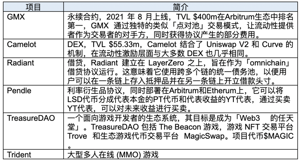 Arbitrum's application ecosystem can be divided into two main categories: DeFi and consumer applications. In the DeFi ecosystem, DEX, lending, and perpetual contracts are the main focus. There are four projects with a TVL of over $100 million, namely GMX, Uniswap V3, Radiant, and AAVE V3.