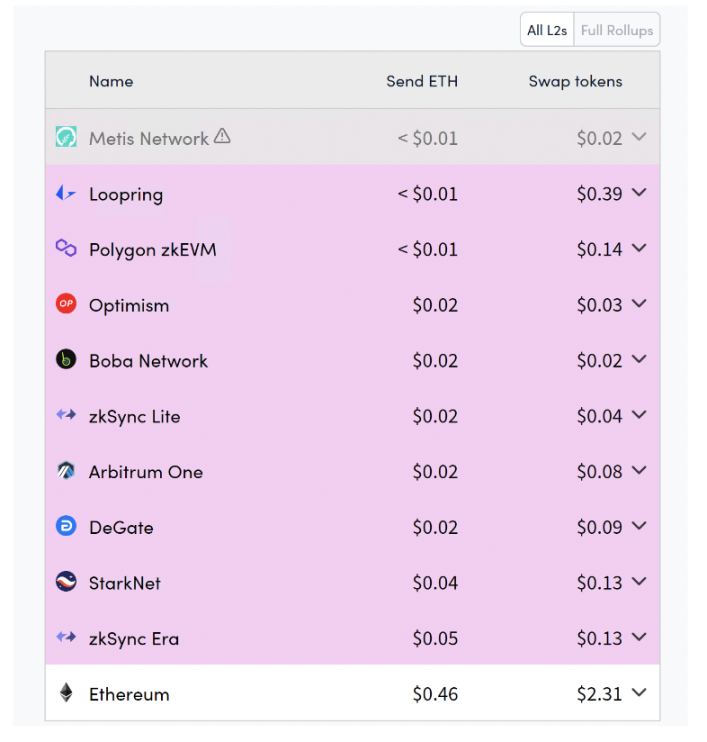Figure 6. Layer 2 fees (Source: l2fees.info)
