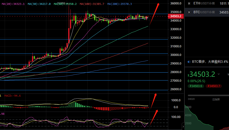 大饼的行情在经过了前期的上涨拉升以后,目前整体行情的走势都是处于下方支撑低位来回进行盘整筑底的状态之中,因为从前期的行情上涨拉升以后,目前下方支撑还是比较明显,因为从前面的行情上涨拉升以后,目前的整体还是处于小幅度来回筑底的状态,对于日内目前的行情后续依旧是可以看涨是没有问题的,下方的支撑目前日内晚间在33300-33500附近,回撤下方的支撑可以继续进行多单的介入,后续上涨行情上方的目标压力在36000附近,后续突破再来继续进行上看就可以了,激进的朋友现在34503附近就可以继续介入多单,到了支撑再来进行补仓,后续筑底完成再来继续进行上看就好!