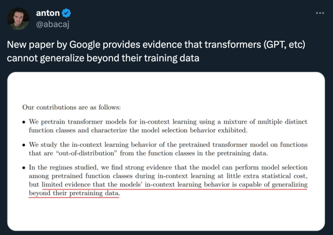 In a recent study, researchers from DeepMind explored this question through empirical research. They framed the generalization problem as follows: "Can a model generate good predictions with in-context examples from a function not in any of the base function classes seen in the pretraining data mixture?"