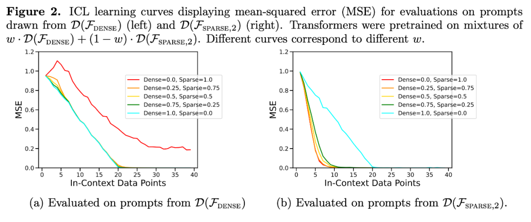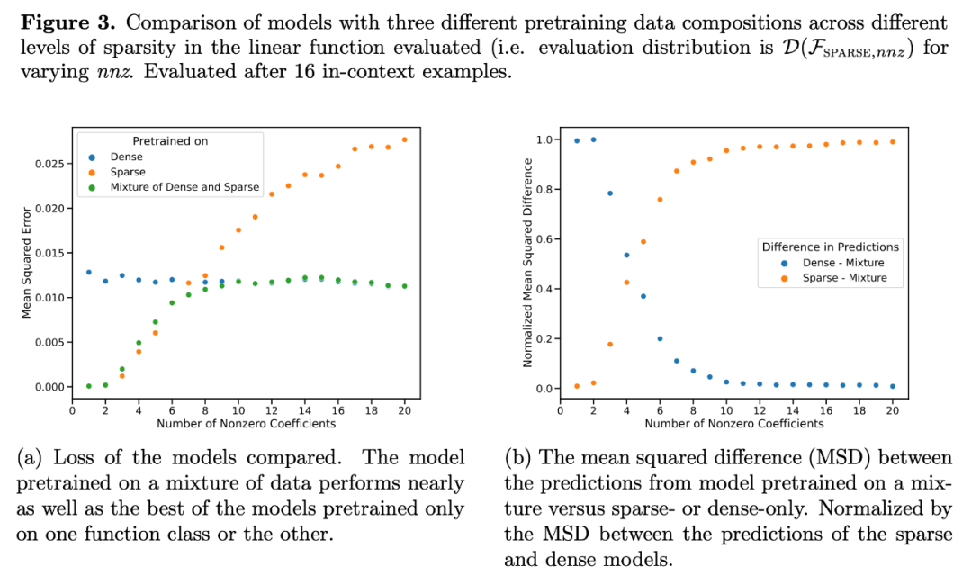 In fact, Figure 3b shows that when the samples provided in the context come from very sparse or very dense functions, the predicted results are almost identical to the predicted results of the model pre-trained using only sparse data or only dense data. However, between the two, when the number of non-zero coefficients ≈ 4, the mixed predicted results deviate from the pure dense or pure sparse pre-trained Transformer predicted results.