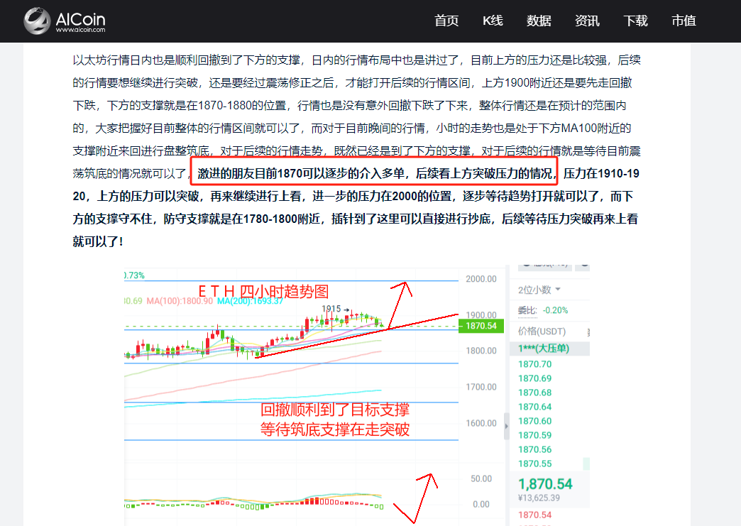以太坊的行情日内也是没有任何的意外拉升上涨了上来,目前也是最高突破到了上方1930的位置,下方支撑坚定看涨也是没有任何的问题,因为目前行情也是在继续的进行突破拉升,而现在的四小时走势也是处于下方支撑逐步向上走突破的状态,后续可以继续等待突破,进一步的压力在2000的位置,而稳健的朋友,晚间可以等待下方的支撑1870-1880继续进行多单的行情介入,后续行情突破拉升以后,在继续等待突破,上方的压力依旧是在1910-1920,压力站上突破以后,再来继续走后续的长线就可以了,进一步的长线在2000的位置,而下方的支撑守不住,防守支撑就是在1800-1820,插针到了这里可以直接进行抄底,顺势走好行情区间,逐步等待长线就可以了!