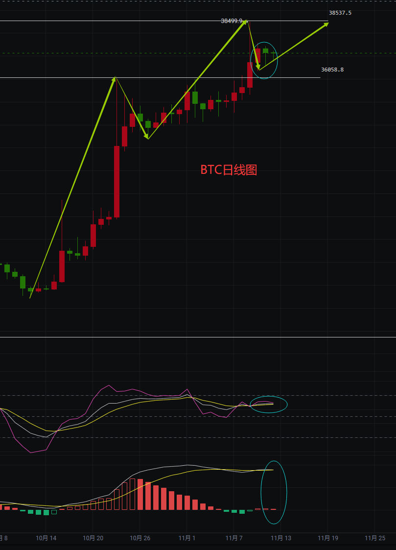 BTC短线4小时行情在日内出现回踩,行情插针触及36600一线后,再次回到37000上方,日线K线回踩低点在抬高,KDJ指标三线目前有金叉向上迹象,MACD指标绿色实体动能柱放量,短线来看,行情目前回踩支撑位有效,短线行情有继续反弹上涨的趋势,日线行情目前K线走势回踩插针低点同样不断抬高,K线暂时承压在BOLL上轨,KDJ指标三线略微拐头向下,MACD指标红色实体动能柱缩量,从日线来看,主图K线虽然连续呈阴K,但行情未收实体,多头护盘力量还是较强的,建议还是以低多为主