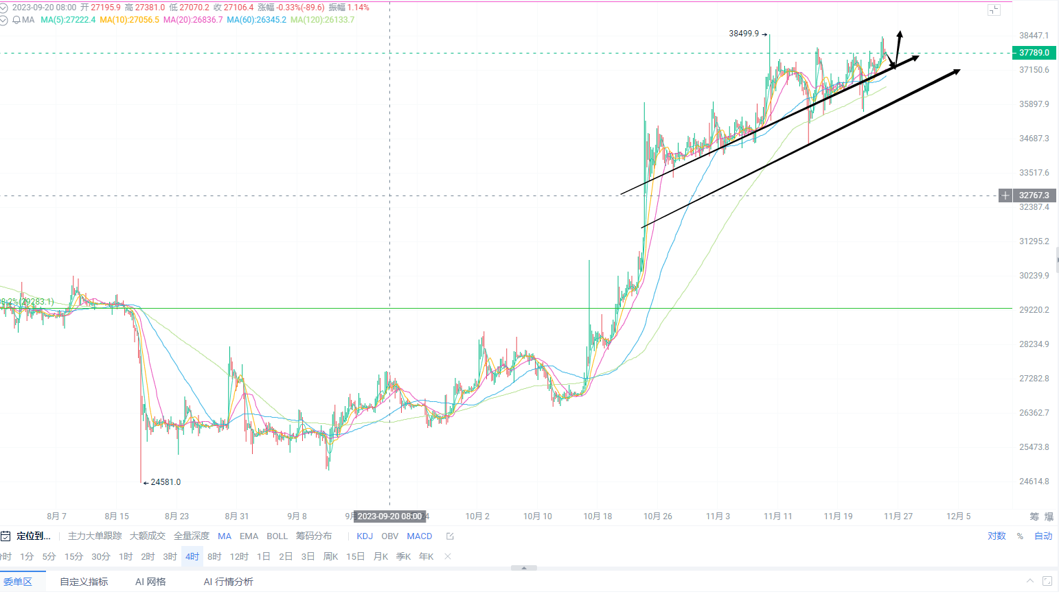 Looking at the technical structure on the four-hour chart, after a series of upward movements, the market turned bearish with increasing volume. In the short term, there is resistance overhead, but the lack of continued downward movement after the overnight retracement suggests that it is not advisable to aggressively chase the rise or fall in the next two days. We should focus on the support and resistance levels on the hourly chart, particularly the range between 38500 and 37400. If these levels are breached, further adjustments should be made. The strategy is to go long during the day and then short in the evening. The positions are set in advance, and the trend is followed. This information is publicly available on Weibo.