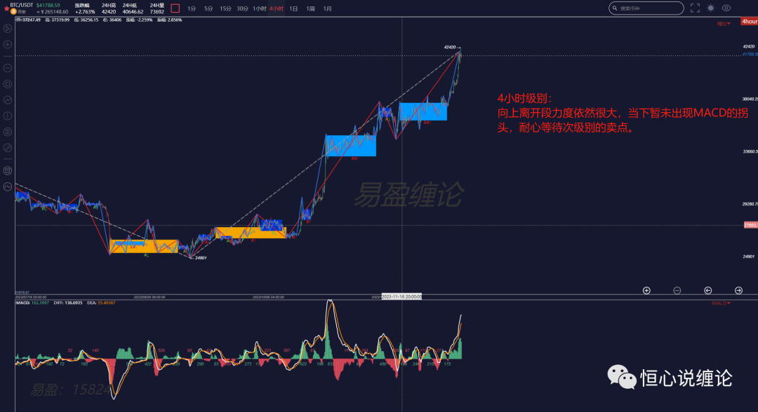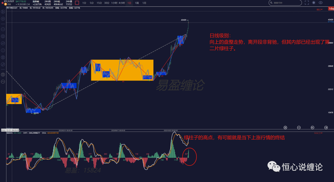 From the structure of the MACD, the appearance of the second green bar, and when the second green bar starts to shorten, it likely represents the end of the uptrend at the daily level (corresponding to the sub-level, i.e., the four-hour level, a sell signal).